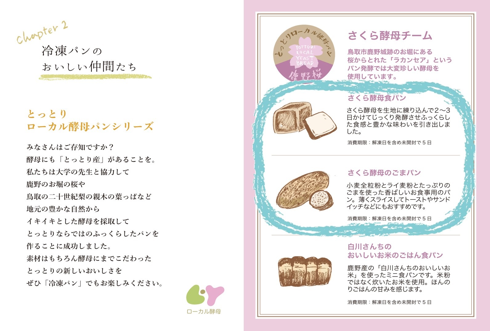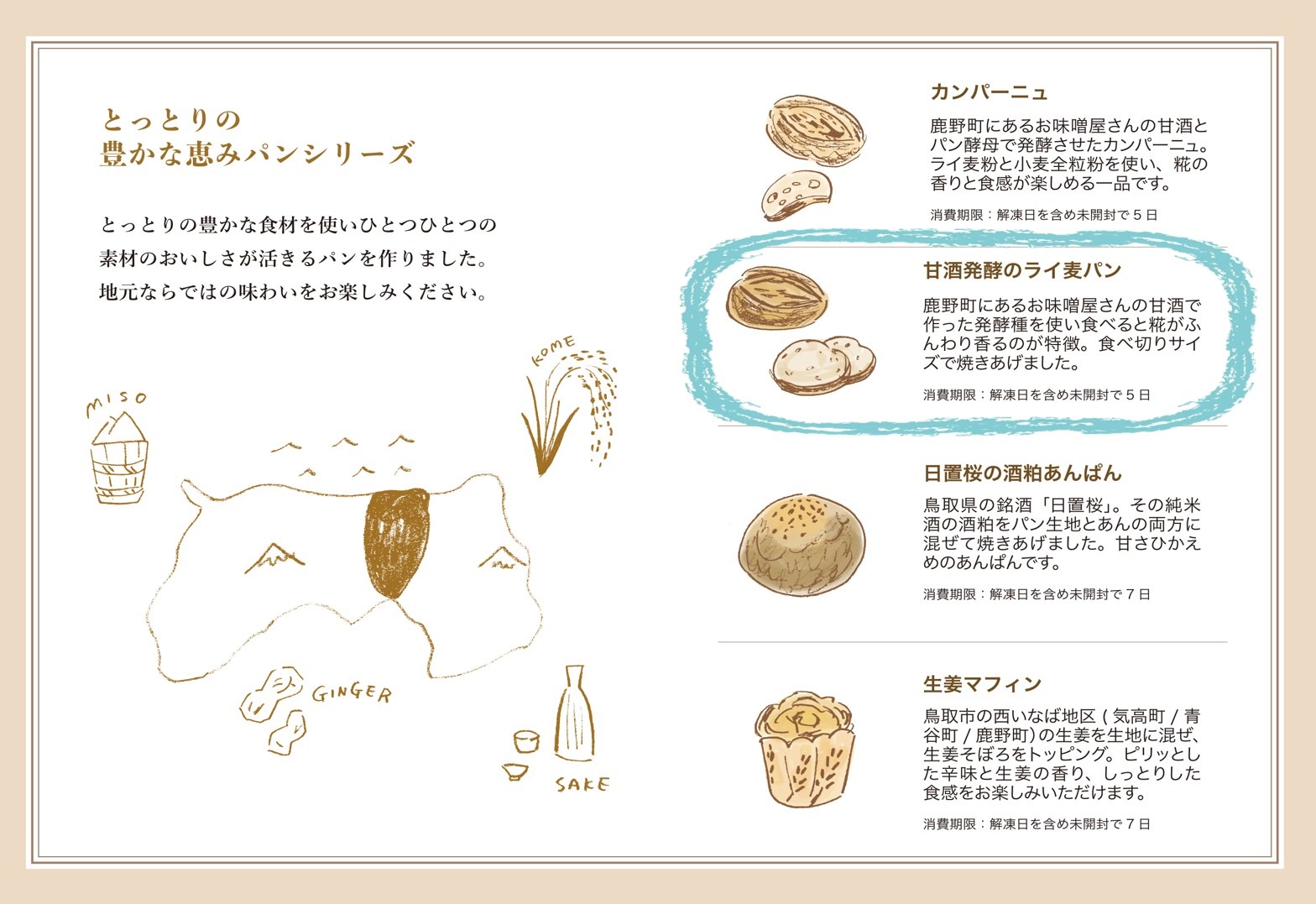 パン一心庵のある鳥取市鹿野町のさくらの酵母、お味噌屋さんの甘糀(甘酒)、農家さんの酒米や鹿野町産そばを使った5種類のパンをお届けいたします。
