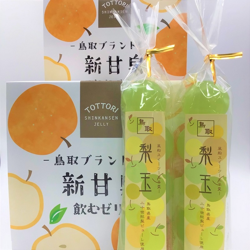 鳥取ブランド梨である新甘泉の飲むゼリーと鳥取県産二十世紀梨ピューレを使用した玉羊羹の梨玉をセットにしました。