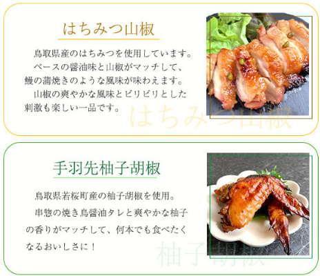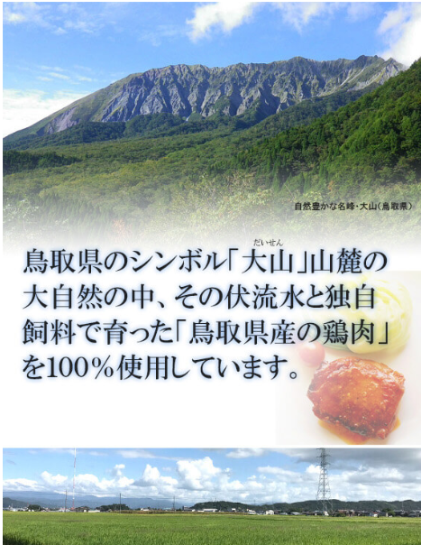 | 原材料名 | トマト&バジル 鶏もも肉(鳥取県産)、液体調味料(植物油脂(国内製造)、香味食用油、食塩、チキンコンソメ、ガーリック、こしょう、レッドべルペパー、バジル、パセリ、オレガノ)、トマトピューレー(鳥取県産)、トマトペースト、塩?跫(米麹、食塩)/調味料(アミノ酸等)、 (一部に小麦・ごま・大豆・鶏肉・豚肉を含む) 塩こうじ&酒粕 鶏もも肉(鳥取県産)、塩?跫(米麹、食塩)、酒粕、(一部に鶏肉を含む) はちみつ山椒 鶏もも肉(鳥取県産)、たれ(醤油、砂糖、発酵調味料)、はちみつ(鳥取県産)、塩?跫(米麹、食塩)、山椒、 (一部に小麦・大豆・鶏肉を含む) 鳥取きのこと砂肝のアヒージョ 鶏砂肝(鳥取県産)、エリンギ、パプリカ、しいたけ(鳥取県産)、塩?跫、液体調味料(植物油脂(なたね油、オリーブ油)、食塩、ローストガーリックパウダー、フライドガーリック、ガーリック、こしょう、香味食用油、パセリ、オレガノ、赤唐辛子、フライドオニオンパウダー)、粉末調味料(塩顆粒、マスタード、こしょう、レモンピール、レッドベルペパー、キャベツチップ(キャベツ、ぶどう糖)、レモン果汁パウダー、チキンエキス、粉糖)/調味料(アミノ酸等)、乳化剤、香料、酸味料、(一部に小麦・大豆・鶏肉を含む) 手羽先柚子胡椒 鶏手羽先(鳥取県産)、たれ(醤油、砂糖、発酵調味料)、塩?跫(米麹、食塩)、柚子胡椒(鳥取県産)、 (一部に小麦・大豆・鶏肉を含む) 銀皮ハラミダッカルビ 鶏ハラミ(鳥取県産)、ナチュラルチーズ、鶏砂肝(鳥取県産)、焼肉のたれ(醤油、砂糖、米発酵調味料、にんにく、水飴、コチュジャン、植物油、唐辛子、豆板醤、XO醤、ごま、野菜エキス、ネギ、酵母エキス、コショー、寒天)、塩?跫、たれ(醤油、砂糖、発酵調味料)/セルロース、増粘剤(加工澱粉、キサンタン)、調味料(アミノ酸等)、パプリカ色素、酸化防止剤(V.C)、紅麹色素、香料 、(一部に乳成分・ごま・大豆・えび・小麦・鶏肉を含む) |