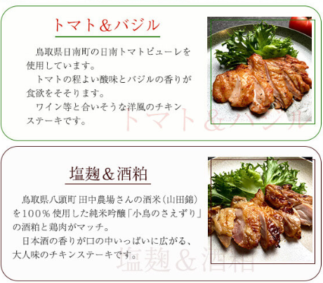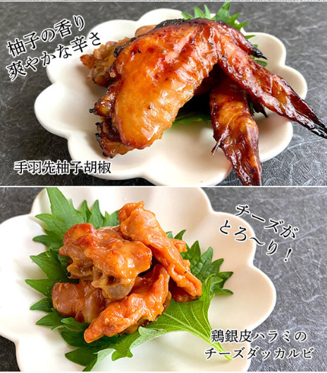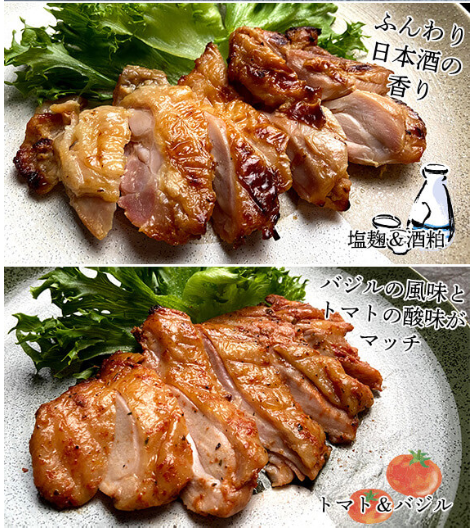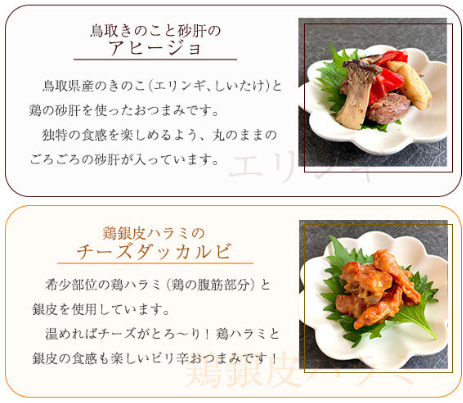 | 内容量 | チキンステーキ(酒粕・はちみつ山椒・トマト&バジル)3種 各1袋 / 居酒屋チキン(ハラミ銀皮ダッカルビ・砂肝と鳥取きのこのアヒージョ・手羽先柚子胡椒味)3種 各1袋 チキンステーキ100g×3、居酒屋チキン100g×2、80g×1 |