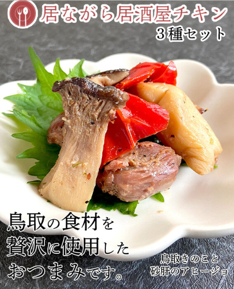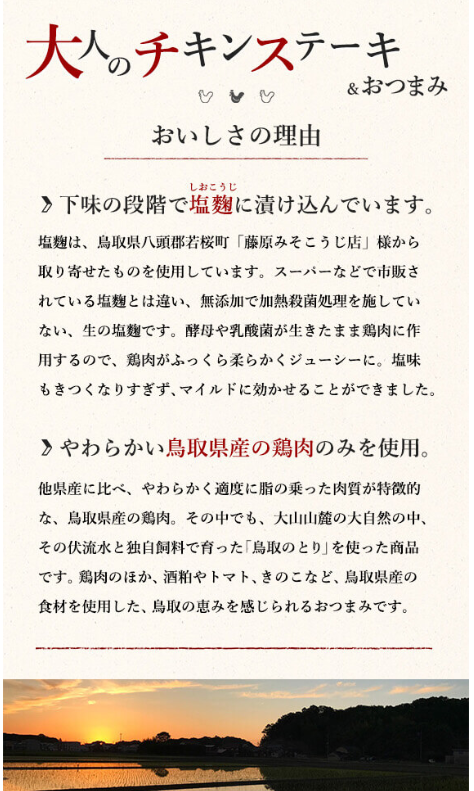 鳥取県産「鳥取のとり」のもも肉を、鳥取産の塩麹にじっくり漬け込み、香ばしく焼き上げたチキンステーキ3種と、鳥取食材をふんだんに使用したおつまみ3種をセットにしました。