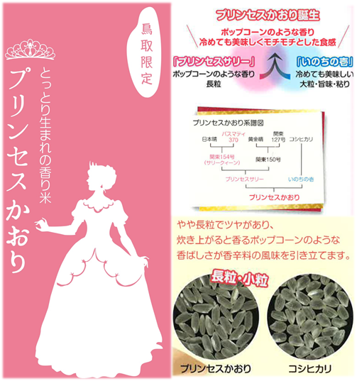 インドの高級香り米品種「バスマティー370」の香りを受け継ぐ「プリンセスサリー」に「コシヒカリ」の大粒突然変異株「いのちの壱」を交配して育成した品種で、「プリンセスサリー」からポップコーンのような香りを、「いのちの壱」から粘りと旨みを引き継いでいる。