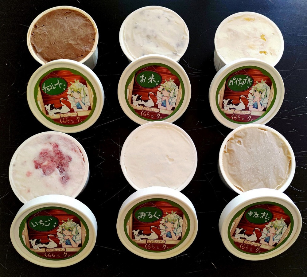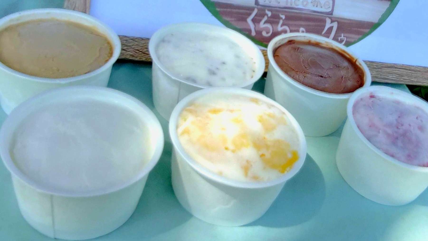 種類はミルク、チョコレート、カフェオレ、フルーツ2種(イチゴ、パイナップル)、お米アイスです!